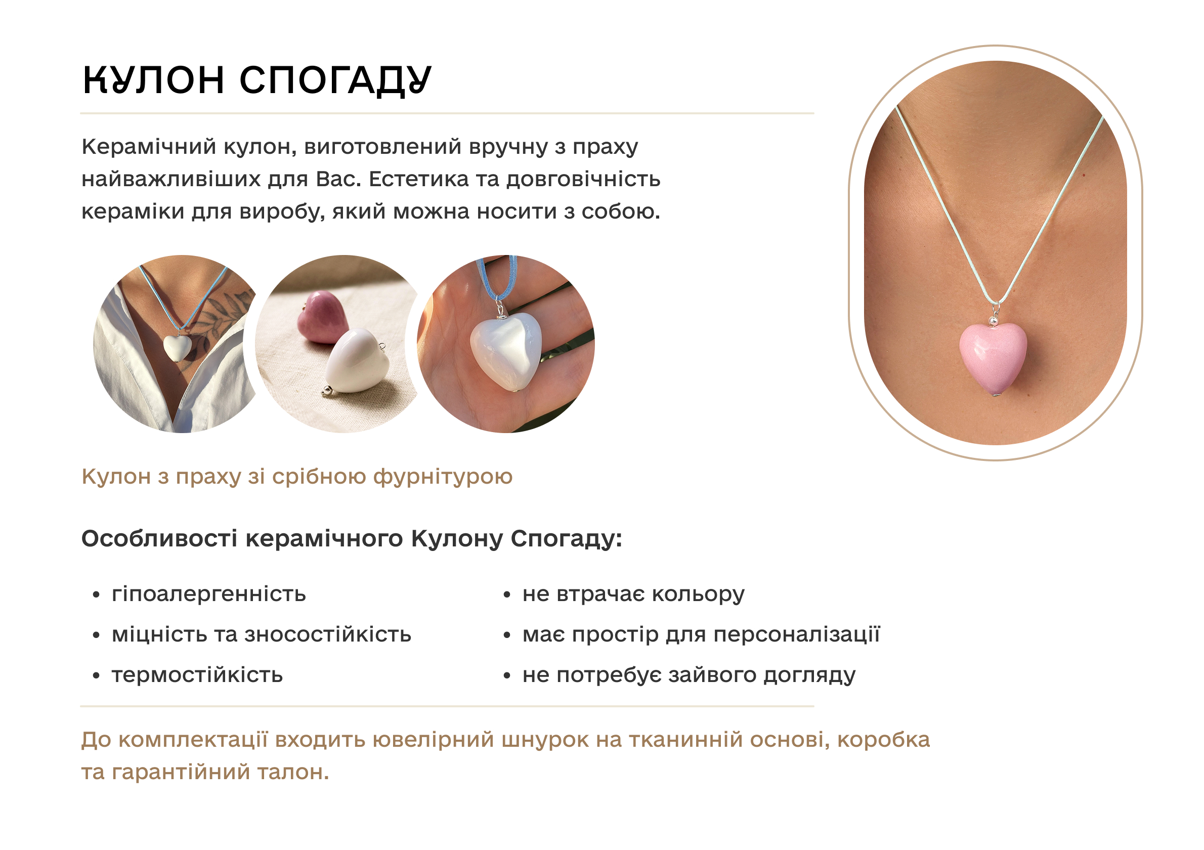 Вироби з праху — це не просто альтернатива урні з прахом, це спосіб забезпечити близькість та безпосередній контакт з пам'яттю про близьку людину.