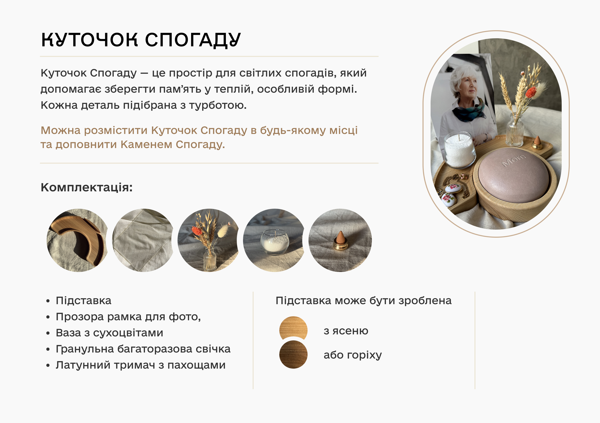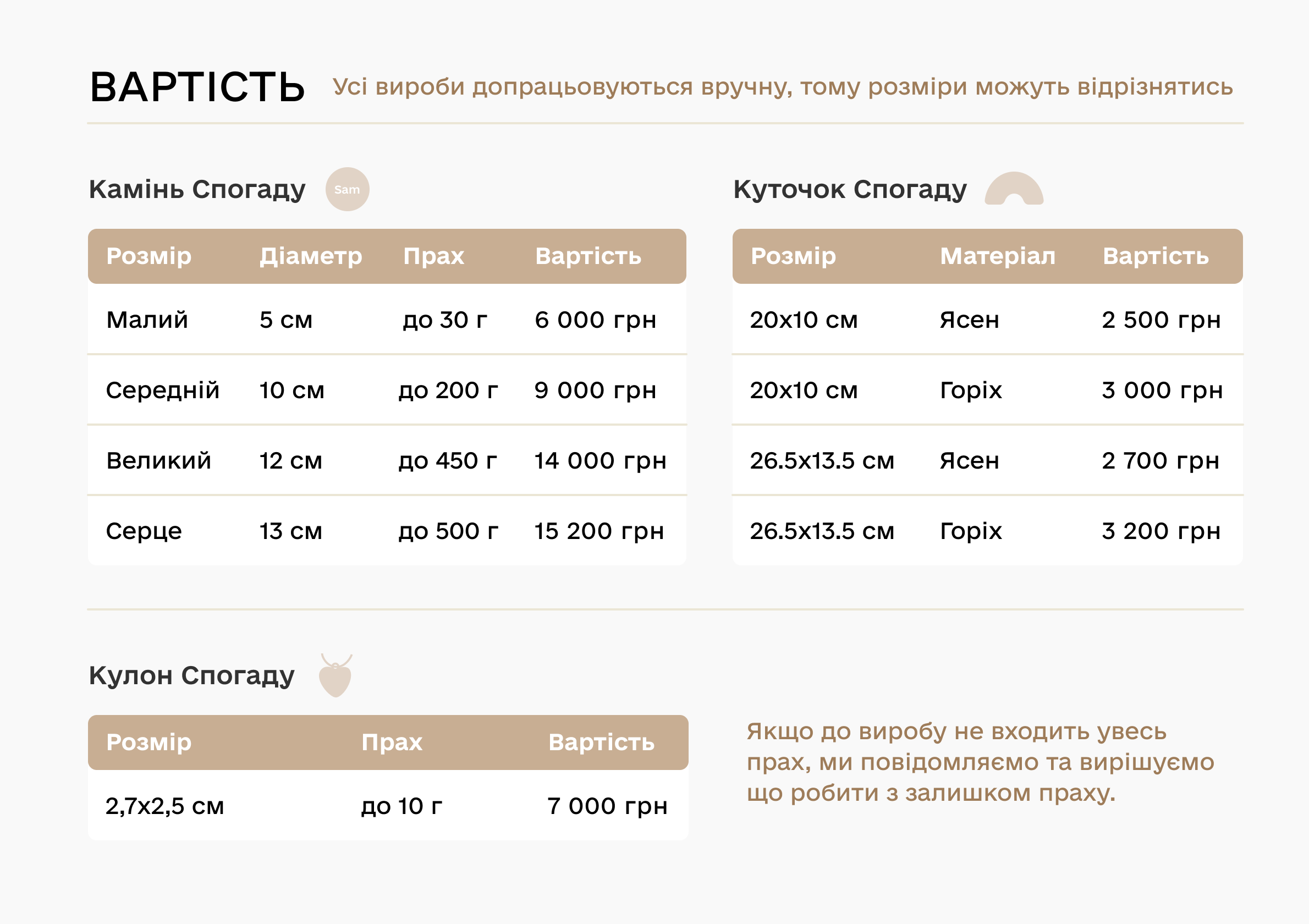 Наша місія – створювати гідні пам’ятні вироби, що допомагають зберегти відчуття близькості з тими, кого ми втратили, а також спрощують процес вивезення праху за кордон і вибору місця для розвіювання.